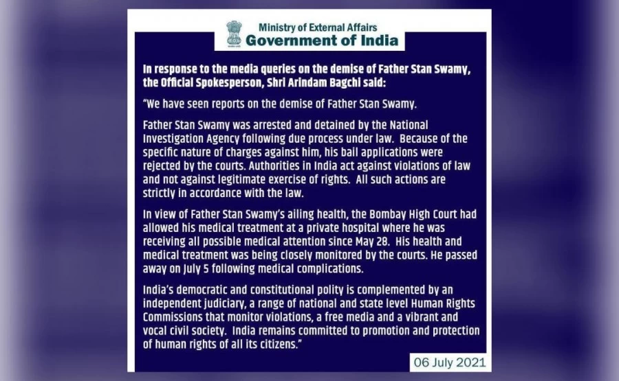 New Delhi: India on Tuesday rejected mounting international criticism over the handling of the case of Father Stan Swamy, an undertrial who died on Monday, saying the concerned authorities act against violations of law and do not restrain legitimate exercise of rights.