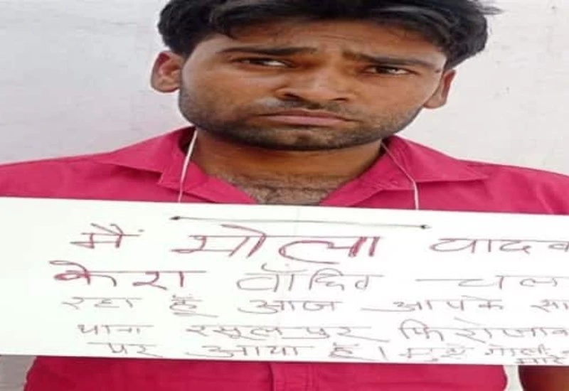 Agra. Fear of police is being created among miscreants in UP. During the tenure of Yogi government, miscreants either have encounters or bulldozers go on their homes. In such a situation, the miscreants are also surrendering in front of the police to save their life and property. One such case happened in Rasulpur police station area of Firozabad. On Saturday, a miscreant reached the police station to surrender with a placard hanging around his neck. This crook was wanted in the robbery that happened 50 days ago. He surrendered at the police station on Saturday.