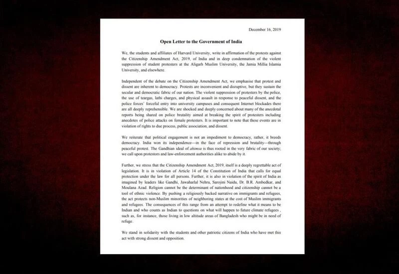 The Harvard University students and affiliates who signed the letter expressed solidarity with the “students and other patriotic citizens of India” who have strongly dissented to and opposed the Act.