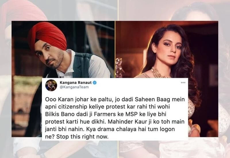 Now, Kangana Ranaut has responded to Diljit's tweet. She called him Karan Johar's pet and wrote, "Ooo Karan johar ke paltu, jo dadi Saheen Baag mein apni citizenship keliye protest kar rahi thi wohi Bilkis Bano dadi ji Farmers ke MSP ke liye bhi protest karti hue dikhi. Mahinder Kaur ji ko toh main janti bhi nahin. Kya drama chalaya hai tum logon ne? Stop this right now."