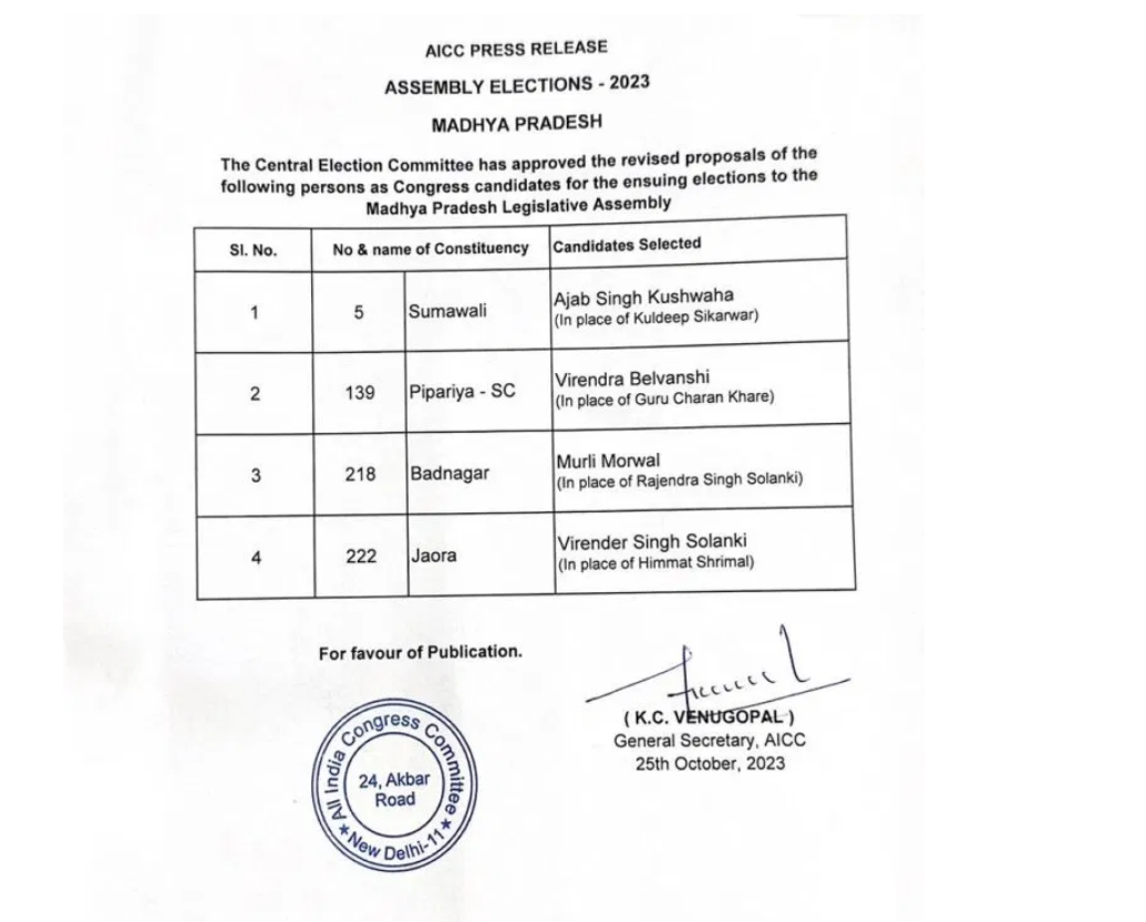 Earlier, Congress had given tickets to Himmat Shrimal from Javra, Kuldeep Sikarwar from Sumawali, Gurucharan Khare from Pipariya and Rajendra Singh Solanki from Vadnagar. Even before this, Congress had changed its candidates on three seats. In the changed seats, Congress had nominated Narmada Prasad Prajapati from Gotegaon in Narsinghpur. Earlier Shekhar Choudhary was given ticket from here.From Datia, Congress had first given ticket to Awadhesh Nayak and later fielded Rajendra Bharti. At the same time, Congress expressed confidence in Arvind Singh Lodhi from Pichhor seat. Earlier Shailendra Singh was given ticket from here.