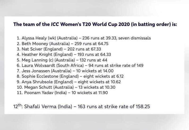 There is also a spot for captain Meg Lanning, who led Australia from the front both with the bat and in the field to guide her country to a fifth Women’s T20 World Cup title.