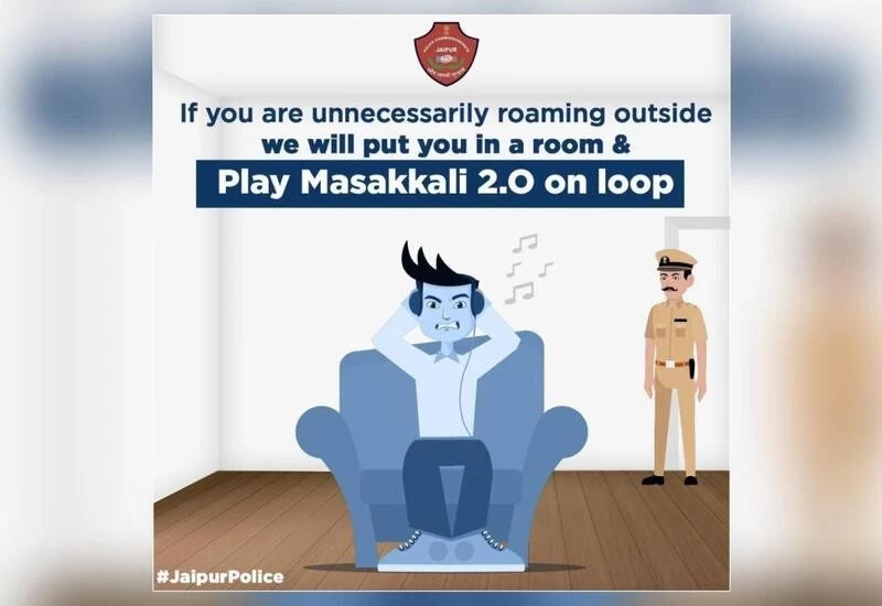 The official Twitter handle of the Jaipur Police shared a poster of a man being forced to listen to what seems like unpleasant music on headphones, with the warning ‘If you are unnecessarily roaming outside we will put you in a room and play Masakali 2.0 on loop’. It was shared with the song’s lyrics, but with a twist: “Mat udiyo, tu dariyo, na kar manmani, manmani, ghar me hi rahiyo, na kar nadani, ae masakali masakali.”