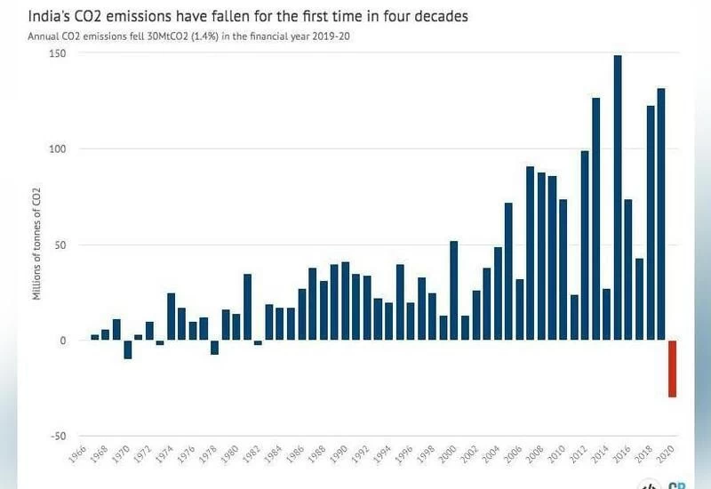 New Delhi: India’s carbon dioxide emissions fell for the first time in four decades as a combination of economic weakness and competition from renewable power limited consumption of fossil fuels.