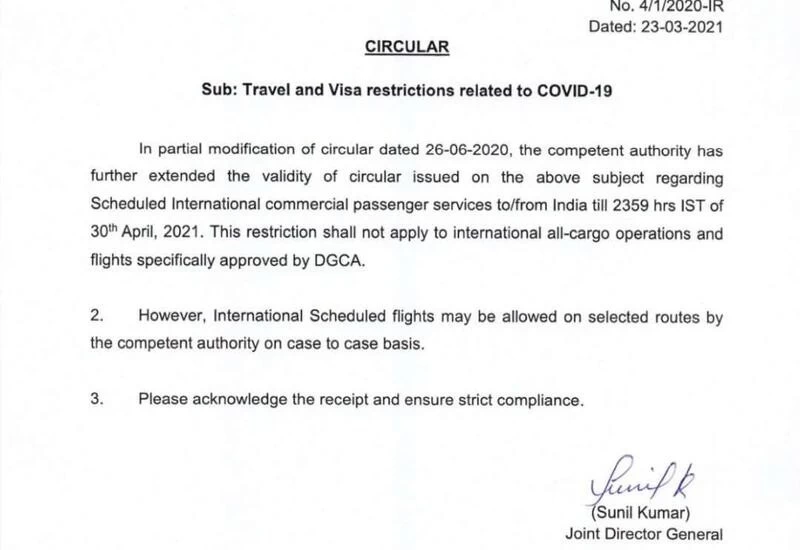 New Delhi: Director-General of Civil Aviation on Tuesday in a circular said that suspension of international flights has been further extended till April 30. However, international scheduled flights may be allowed on selected routes by the competent authority on case to case basis.