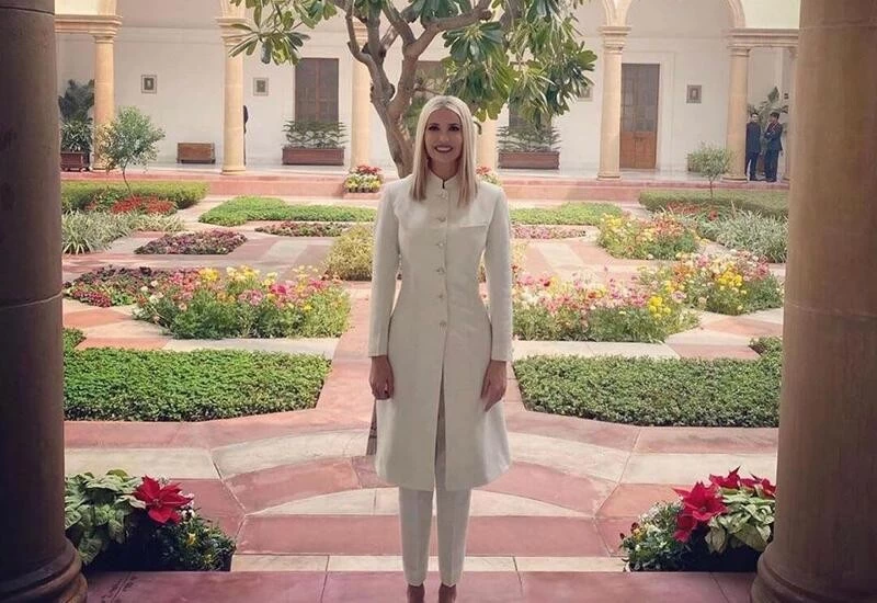 For the event, Ivanka picked out a pristine white indo-western outfit by Indian designer Anita Dongre. She picked out a crisp white full-sleeve bandhgala sherwani that is made from handwoven silk from Murshidabad, West Bengal and is a classic style that has been created 23 years ago by the designer. It also featured large buttons and Ivanka paired this with straight white pants of the same colour to complete her look. Matching ballet flats with large buckles on them completed her elegant yet classy look. Her hair was styled into her usual sleek bob while minimal makeup completed her look for the event.