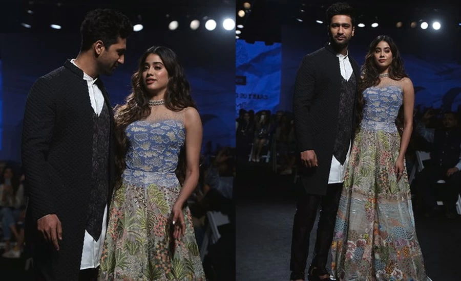 The two walked the ramp for designer Kunal Rawal and both of them definitely looked just about perfect together. Janhvi's outfit was rather simple yet stunning as she wore what seems like a printed dress in blue and green while Vicky opted for a black and white outfit.