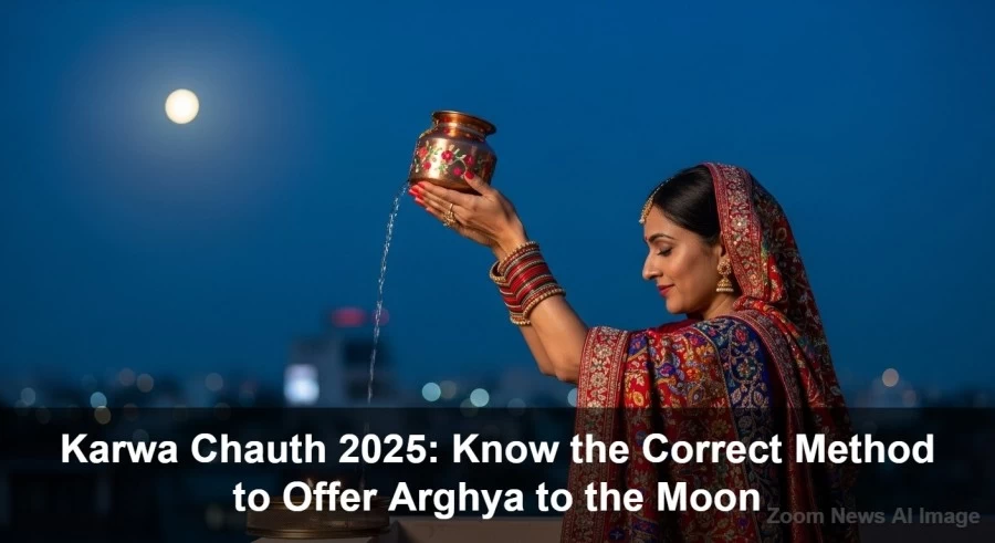After performing the puja and listening to the fast story, women should offer Arghya to the moon after moonrise. It's advised to add a silver coin and Akshat (unbroken rice grains) to the kalash (pot) before offering Arghya. While offering Arghya to the moon on Karwa Chauth, one's face should be directed towards the North-West direction. According to beliefs, women shouldn't offer Arghya to the moon during Sutak, Patak, or menstruation. In such situations, they should only offer five grains of rice. To the moon and have someone else narrate the fast story. Disclaimer: The information provided in this news is based on religious beliefs and general knowledge. Zoom News doesn't confirm its authenticity.