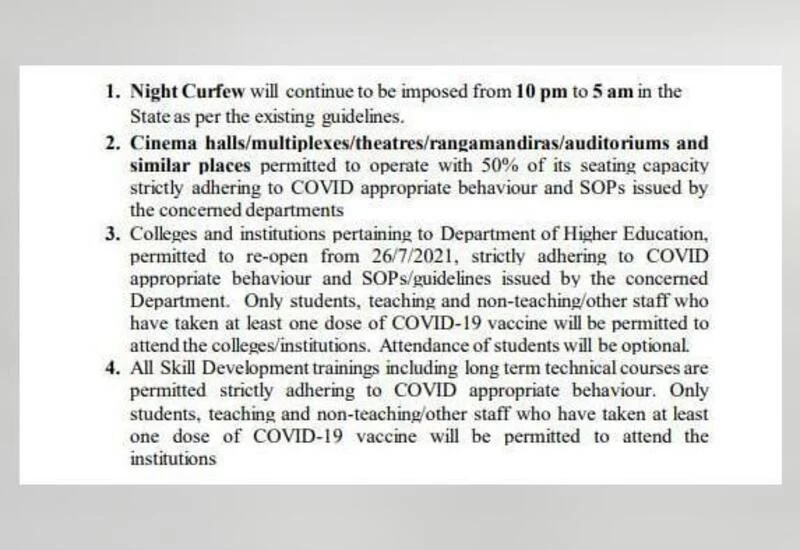 Night curfew, which was from 7 PM to 5 PM was further relaxed by two hours from July 5 and was in force from 9 PM to 5 AM. From Monday, it will be in force from 10 PM to 5 AM. The government relaxed the norms after the COVID cases came down substantially. The state reported 1,869 fresh infections, 42 deaths and 30,082 active cases on Saturday.