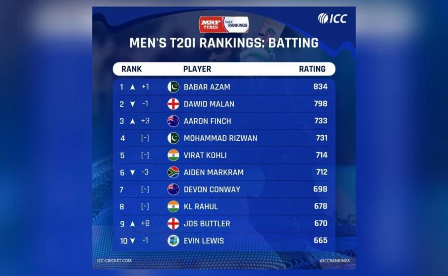 Babar now has a total of 834 rating points, which is 36 more than the second-placed Malan.