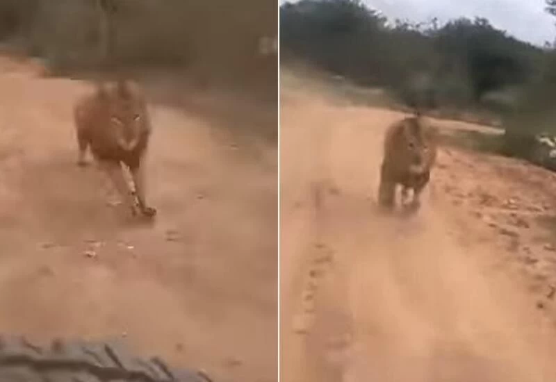 The video – which is equal parts scary and thrilling – shows a lion chasing a tourist safari vehicle. Almost a minute long, the clip shows the lion fiercely chasing the car. The animal keeps on running behind the car until the vehicle speeds up and moves away.