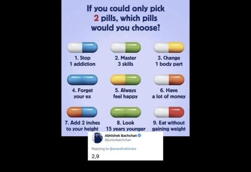 Actor Abhishek Bachchan was among the hundreds of people who responded to his tweet. The Manmarziyaan actor picked pills number 2 and 9, which would give him the ability to "Master three skills" and "Eat without gaining fat".
