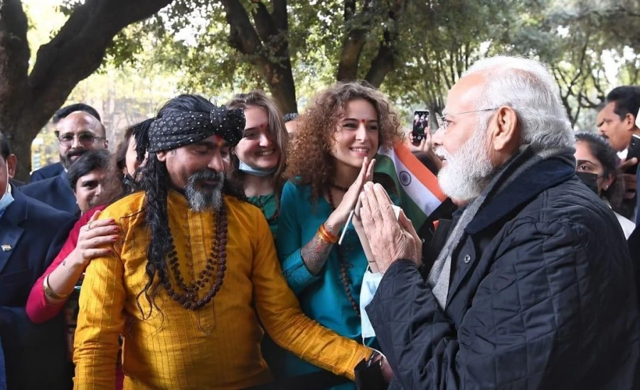 Slogans of 'Modi, Modi' were heard as PM Modi interacted with people holding up tiny Indian flags at Piazza Gandhi.
