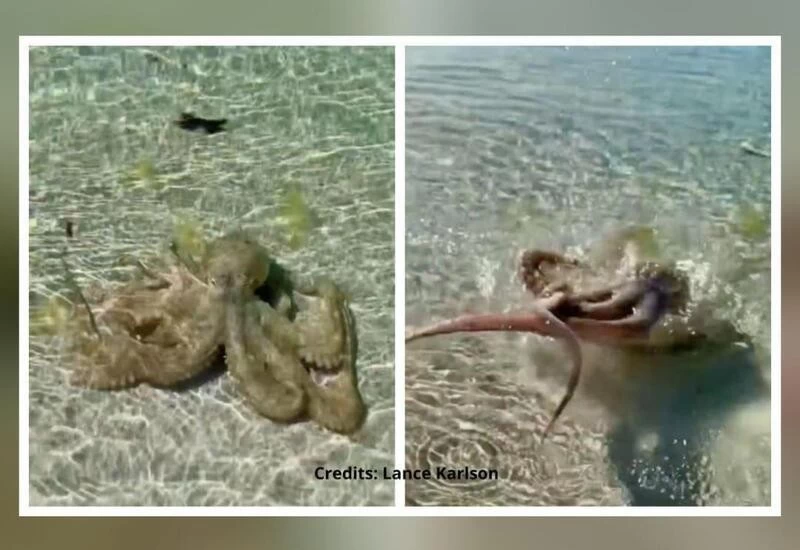 Upon walking closer with his two-year-old daughter, he discovered it was an octopus, and took a video, which shows the animal in shallow water take a sudden strike in Karlson’s direction with its tentacles.