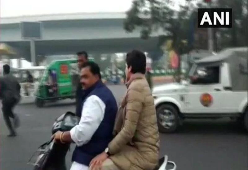 Congress leader Dheeraj Gurjar drove the two-wheeler and Priyanka Gandhi on Saturday evening, the party workers said.