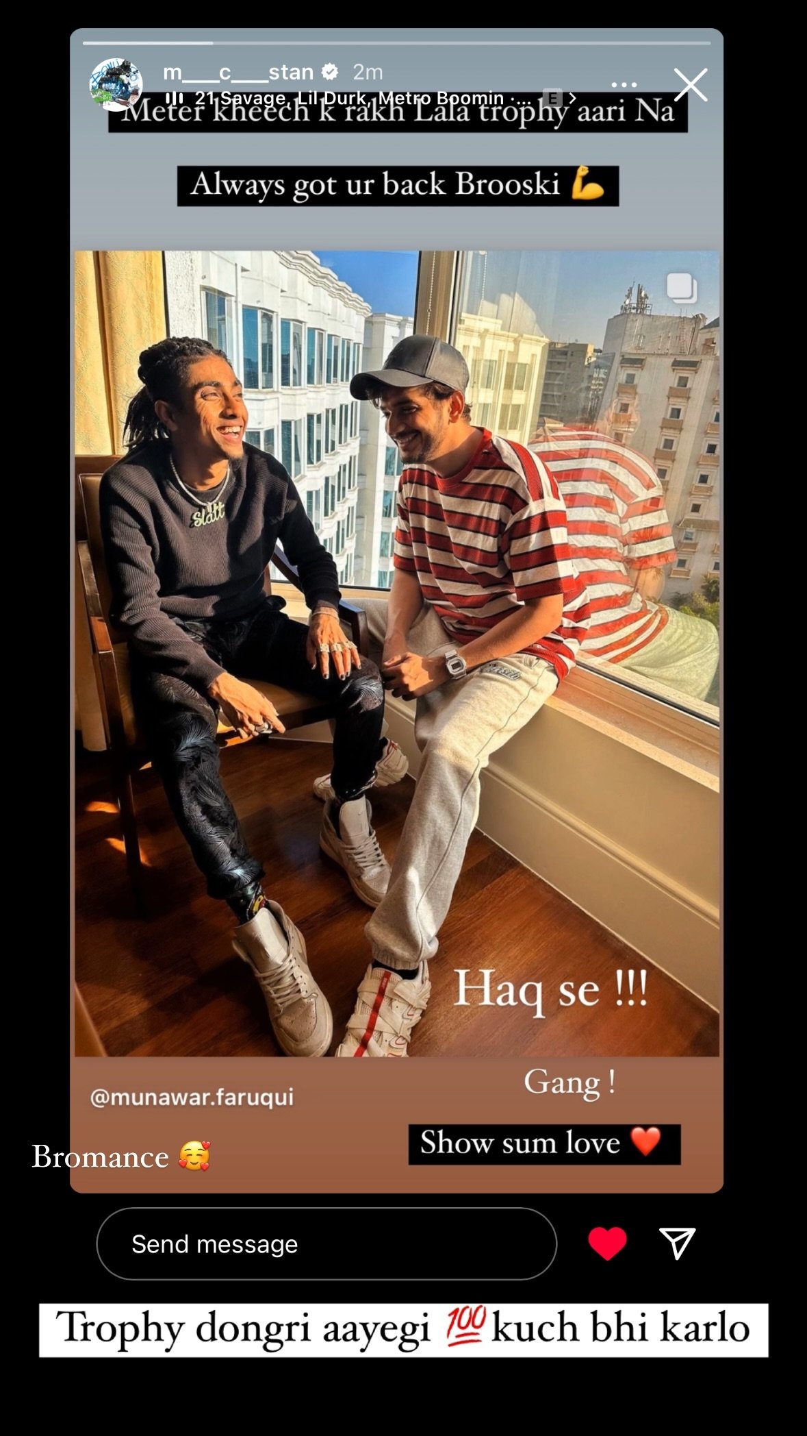 Bigg Boss 17: 'Bigg Boss 17' contestant Munawar Faruqui remains in the news because of his personal life in Salman Khan's most controversial show 'Bigg Boss 17'. Ayesha Khan and Munawwar remain in the headlines on social media. When Ayesha Khan entered the show as a wild card contestant, the stand-up comedian's personal life was made public. Now, due to these new revelations, Munawwar has become a constant topic of discussion. He made shocking revelations about Munawwar cheating the girls and duping them twice and also made many other allegations. Meanwhile, 'Bigg Boss 16' winner MC Steyn is seen supporting his close friend Munawar Faruqui.MC Stan supported MunawwarAmidst this ongoing controversy, many celebs have supported Munawar Faruqui. Now in this list, 'Bigg Boss 16' winner MC Stage who is a close friend of Munawwar. MC has supported Munavvar by sharing a photo in his Instagram story. While sharing the picture he wrote, 'Lala trophy is coming after pulling the meter. Brewski always has your back. By right!!! Gang! Show some love.'See photo here-