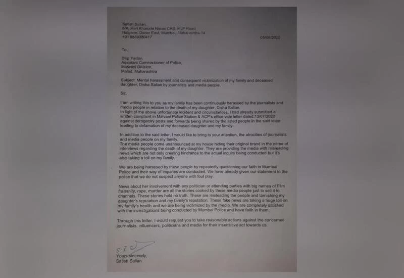 However, Disha's father Satish Salian has written to Dilip Yadav, Additional Commissioner of Police, Malwani District, Malad, Maharashtra over mental harassment of family and consequent victimisation of deceased daughter Disha by media and journalists.