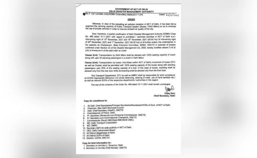 In an order dated November 19, the DDMA said 30 standing passengers will be allowed in each Metro train coach. In Delhi Transport Corporation (DTC) and Cluster buses, the maximum number of passengers allowed to travel in a standing position will be 50 percent of the seating capacity.