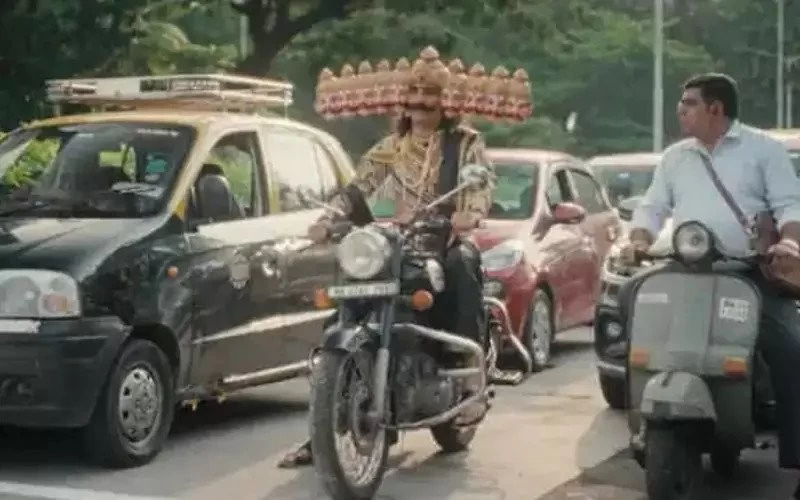 In the video shared by Mumbai Police on Instagram, a man Ravana can be seen in the role of Ravana. In the video shared on the day of Vijayadashmi, Ravana can be seen leaving the house and going on a bullet. On his way to the red light, Ravana meets a man who is seen driving without a helmet. Instead of wearing the helmet, he has hung it in the car.