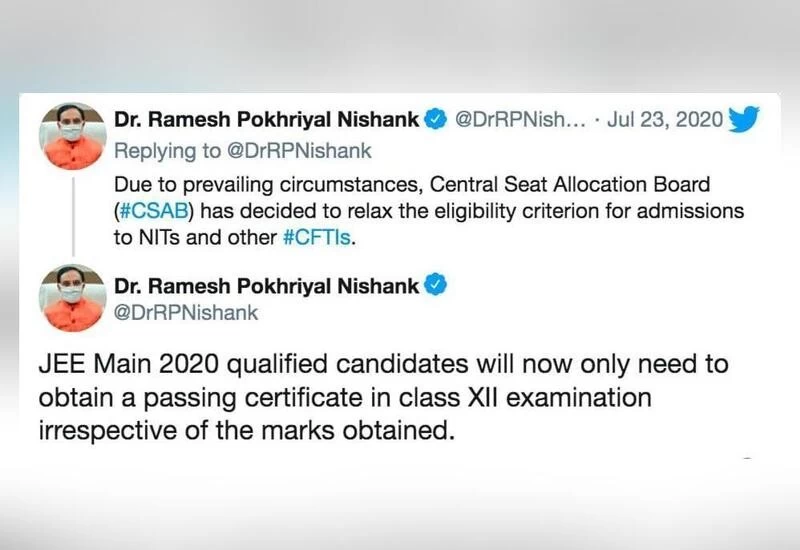 The Minister on his official twitter handle wrote, “JEE Main 2020 qualified candidates will now only need to obtain a passing certificate in class XII examination irrespective of the marks obtained.”