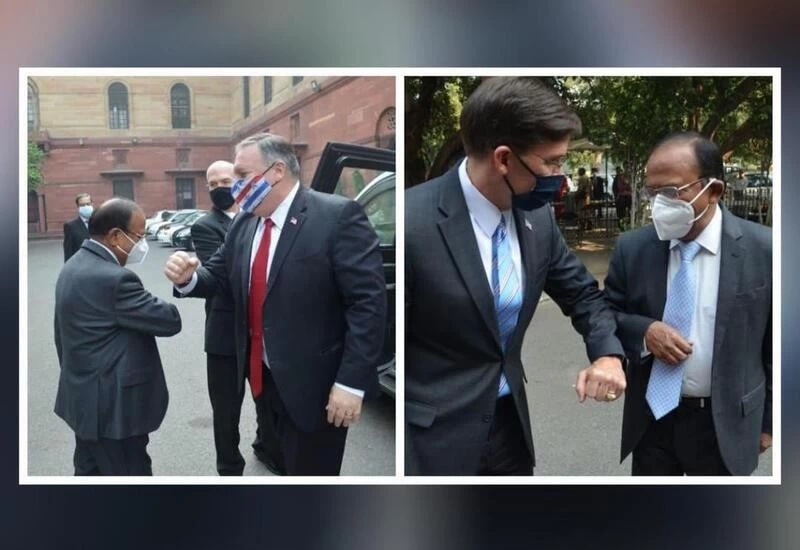 New Delhi: National Security Advisor Ajit Doval exchanged elbow bumps, skipping the conventional handshake, with US Secretary of State Mike Pompeo and Defence Secretary Mark T Esper today in Delhi, following social distancing norms amid the coronavirus pandemic.