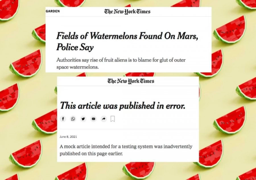 New York: The New York Times briefly published a story titled ‘Fields of Watermelons Found On Mars, Police Say.’ The article was soon removed, but not before a number of people found it, archived it, and speculated about what it meant. The article’s page has since been replaced with an error notice alerting readers that the article was published by mistake — and, yes, the content was entirely fake.