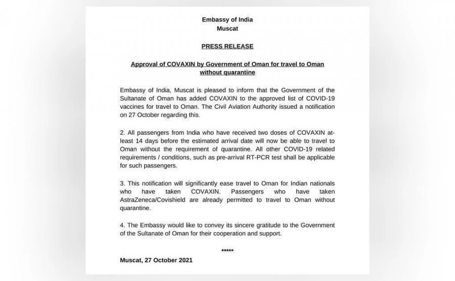 "All passengers from India who have received two doses of Covaxin at least 14 days before the estimated arrival date will now be able to travel to Oman without the requirement of quarantine. All other COVID-19 related requirements/conditions, such as pre-arrival RT-PCR test shall be applicable for such passengers," read the press release of the Indian Embassy.