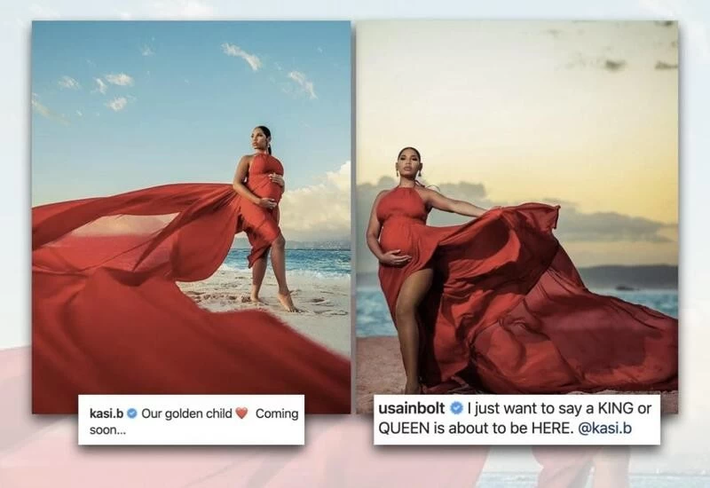 Bolt let a series of fashion shoot-style photos do most of the talking alongside his brief announcement, posting a shot of Jamaican model Bennett holding her baby bump on a beach while wearing a flowing red dress.