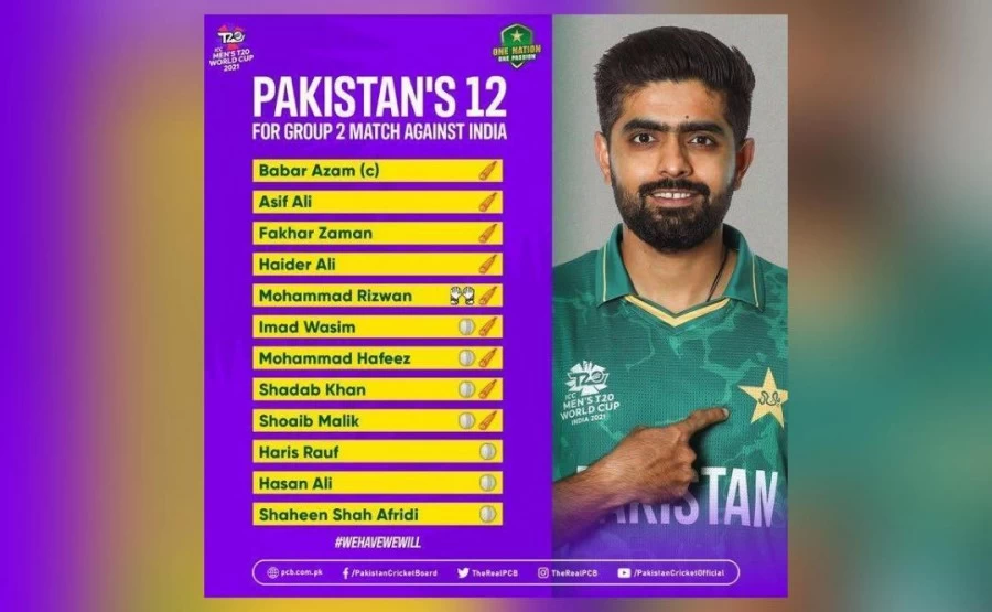 Babar Azam (C), Mohammad Rizwan(wk), Fakhar Zaman, Mohammad Hafeez, Shoaib Malik, Asif Ali, Haider Ali, Imad Wasim, Shadab Khan, Hasan Ali, Shaheen Shah Afridi, Haris Rauf