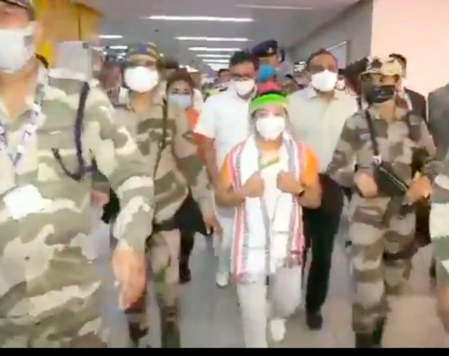 Chanu walked out of the Indira Gandhi International Airport, flanked by security and clad in a face shield and mask.