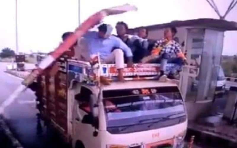 It is seen in the video that a mini truck comes to a stop at the toll block, some people are riding on that truck, who are sitting with their legs hanging in the very front. As the small truck comes to a stop at the toll, its barrier comes down and starts hitting the head of the people on the truck.