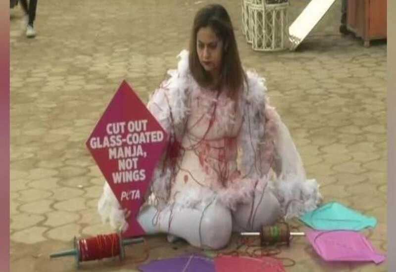 Mumbai: Lamenting the plight of birds that get fatally wounded by the glass-coated 'manjhas' during the festival of Lohri when kites galore the sky, a PETA activist on Friday donned herself as a bird bleeding profusely due to slits all over the body. Every year, several birds succumb to their injuries or are crippled for life due to the wounds received from the glass-coated manjhas. Gunjan Sikka, a social activist of PETA World also held a kite-shaped poster, which read: "Cut out glass-coated manjha, not wings".
