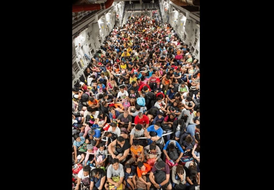 The caption read, "More than 670 Tacloban residents sit on board a C-17 Globemaster III before being evacuated to Manila following Super Typhoon Haiyan, which hit the Philippines Nov. 17, 2013."