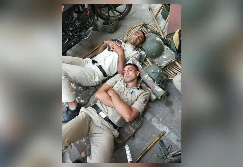 The image shows two cops sleeping on the ground after serving long duty hours. Shared by Deputy Inspector General of Police, Arunachal Pradesh, Madhur Verma on Twitter, the post has prompted all sorts of appreciative comments.