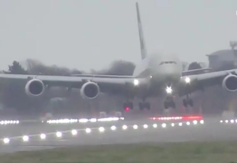 Footage shows the pilot’s skilful manoeuvre, as the Etihad Airbus A380 aircraft hovered sideways over the runway before successfully landing on Saturday.