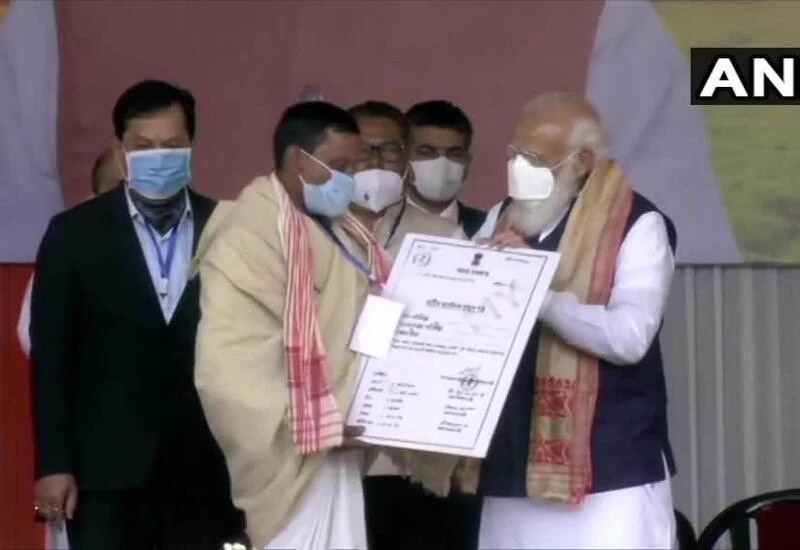Shivsagar: Prime Minister Narendra Modi arrived in Assam on Saturday and distributed land pattas/allotment certificates to indigenous people in Sivasagar, under the state government programme to one lakh beneficiaries.