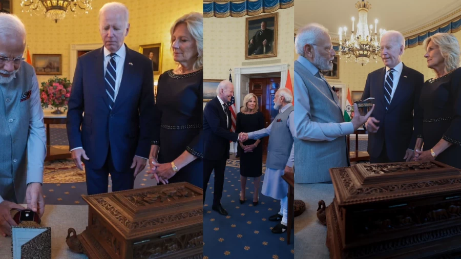 Prime Minister Narendra Modi exchanges special gifts with United States President Joe Biden and First Lady Jill Biden at the White House in Washington, DC.