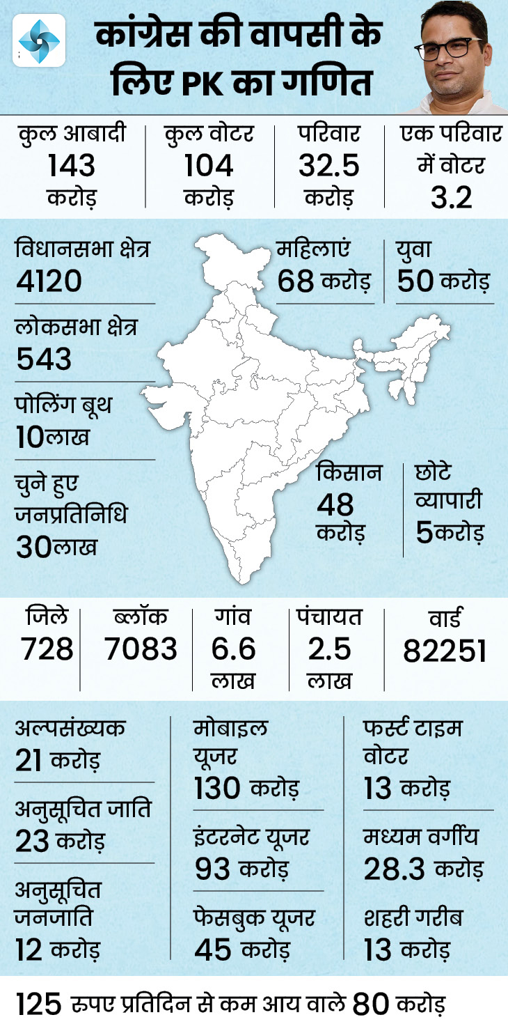 The presentation given by Prashant Kishor was given to Sonia Gandhi in June last year. In this, the figures of India's population, voters, assembly seats, Lok Sabha seats have been kept. Not only this, he has even mentioned the number of women, youth, farmers and small traders. It has also focused on 13 crore first time voters in 2024.