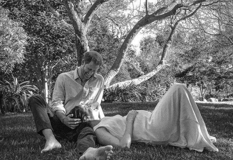 The Valentine’s Day announcement was accompanied by a black and white photograph of a visibly pregnant Meghan lying on grass with one hand on her stomach and her head resting on the smiling prince’s leg. The photo was taken by longtime friend and photographer Misan Harriman.