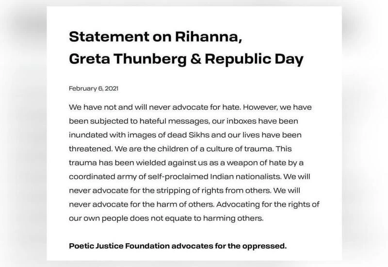 Poetic Justice Foundation alleged that they have been receiving hateful messages from ‘self-proclaimed Indian nationalists’, despite not advocating hate or harm at any point. “We were drawn to the Farmers Protest due to our connection and love for our people. This made us especially aware of the many human rights violations occurring in India,” it said.