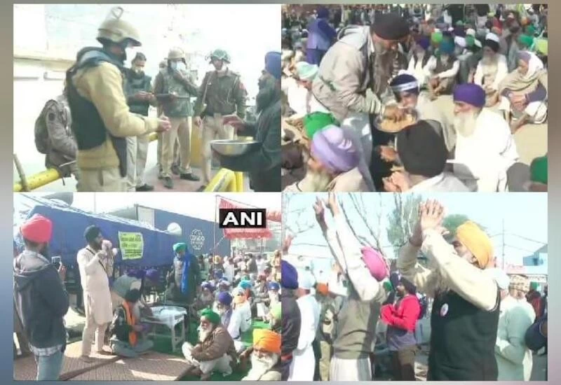 New Delhi: Farmers protesting against the farm laws were seen offering prayers and distributing prasad among each other and security personnel at Delhi border on the occasion of the 551st birth anniversary of Guru Nanak Dev, the founder of Sikhism, today.