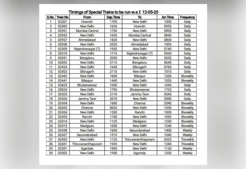 The Ministry of Railways announced the timings of the trains tat will run from 12 May, 2020: