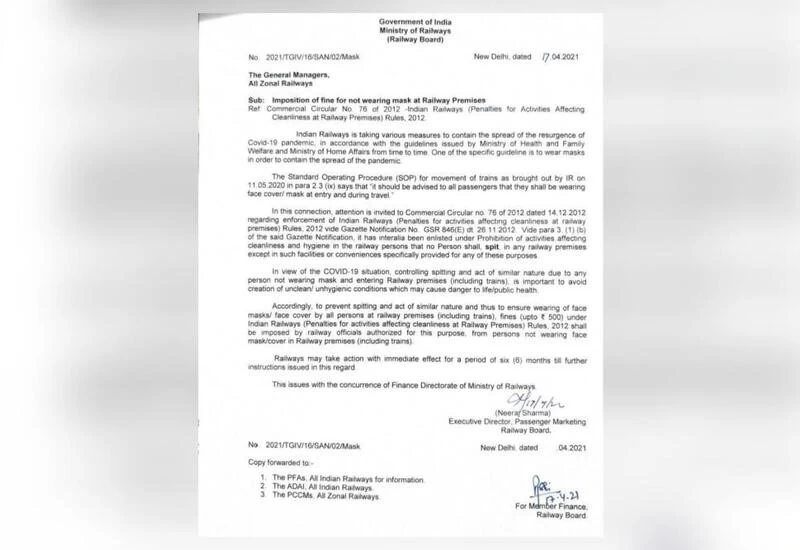 New Delhi: In line with the preventive measures taken by the Centre against the spread of the coronavirus disease (Covid-19), the Indian Railways on Saturday announced a fine of ₹500 for people found to be violating face mask norms in trains and stations. The railways also advised travellers against spitting and "acts of similar nature" as it announced the fine of up to ₹500 under penalties for activities affecting cleanliness at its premises. The fine will be imposed with immediate effect for a period of six months till further instructions are announced, it said.