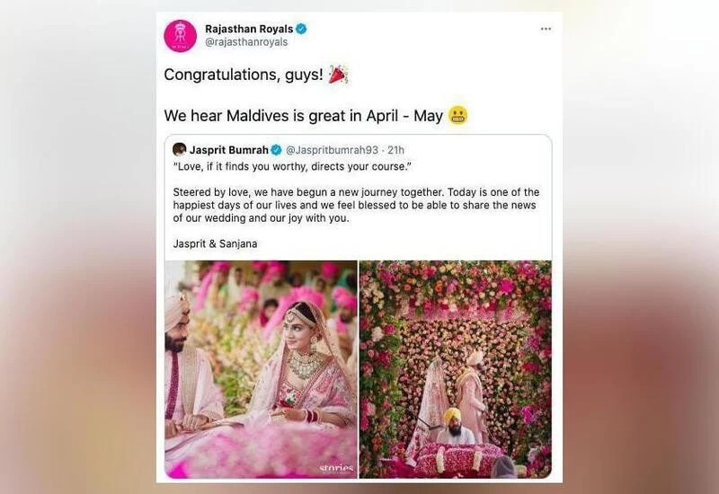 But the message that has caught everyone’s attention was from IPL franchise Rajasthan Royals’ Twitter account. The Royals congratulated Bumrah and Sanjana on their wedding before hilariously suggesting that the couple can take off to the Maldives for their honeymoon during the months of April and May, the months when IPL 2021 will be played.
