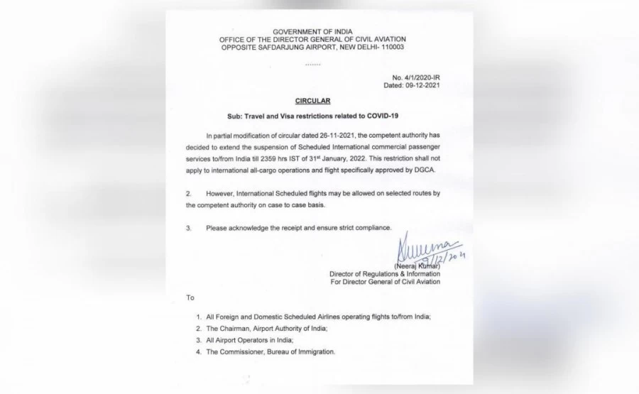 The regulator issued a circular on Thursday, saying "The competent authority has decided to extend the suspension of scheduled international commercial passenger services to and from India till 2359 hours of January 31, 2022."