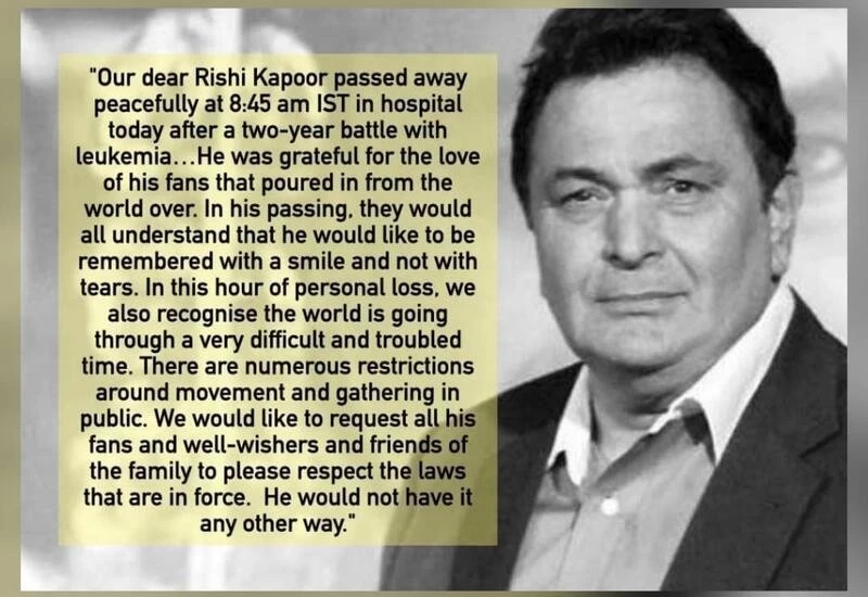 Our dear Rishi Kapoor passed away peacefully at 8:45am IST in hospital today after a two-year battle with leukemia. The doctors and medical staff at the hospital said he kept them entertained to the last.