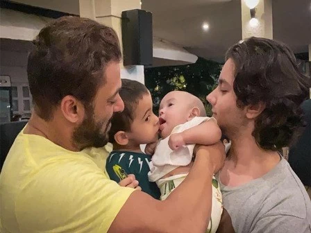 The ‘Dabangg’ actor took to his Instagram handle and shared an adorable picture of his with his nephew Nirvan, Ahil and niece Ayat. In the picture Salman is seen holding the baby Ayat, Ahil taking a chance to kiss her and Nirvan standing beside them.