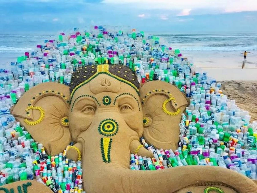 Acclaimed sand artist Sudarsan Pattnaik has created a sand sculpture of Lord Ganesh with 1000 plastic bottles around it at Puri beach to give a message against single-use plastic to save the environment.
