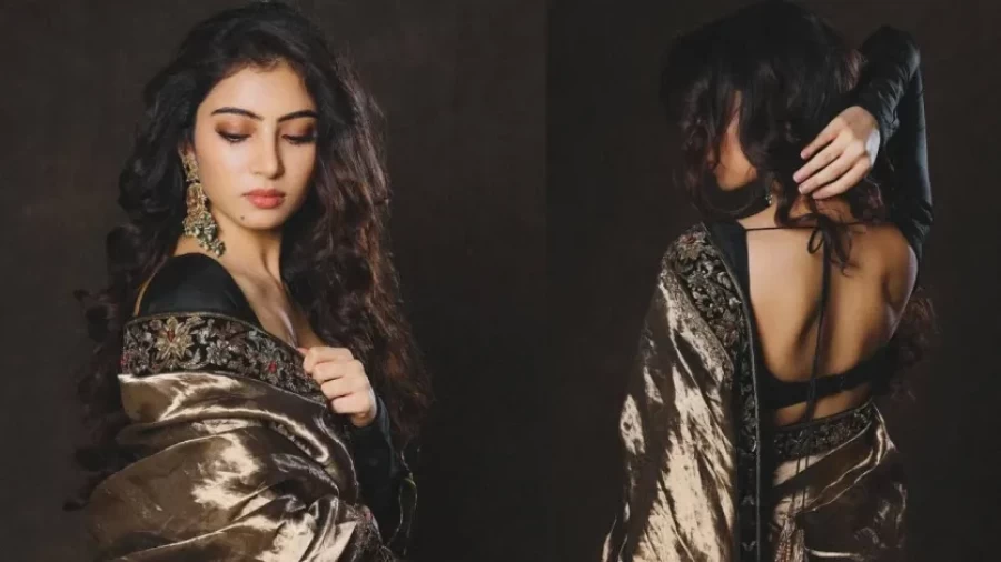 For the 'Euphoria' premiere, Sara Arjun opted for a custom tissue silk saree from the renowned label Divani. The garment featured a distinct metallic sheen, which she paired with a full-sleeved black blouse. Her look was accessorized minimally with large statement earrings, emphasizing an elegant and regal aesthetic, while according to fashion critics, this choice reflects a mature understanding of style, setting her apart from her contemporaries in the industry.