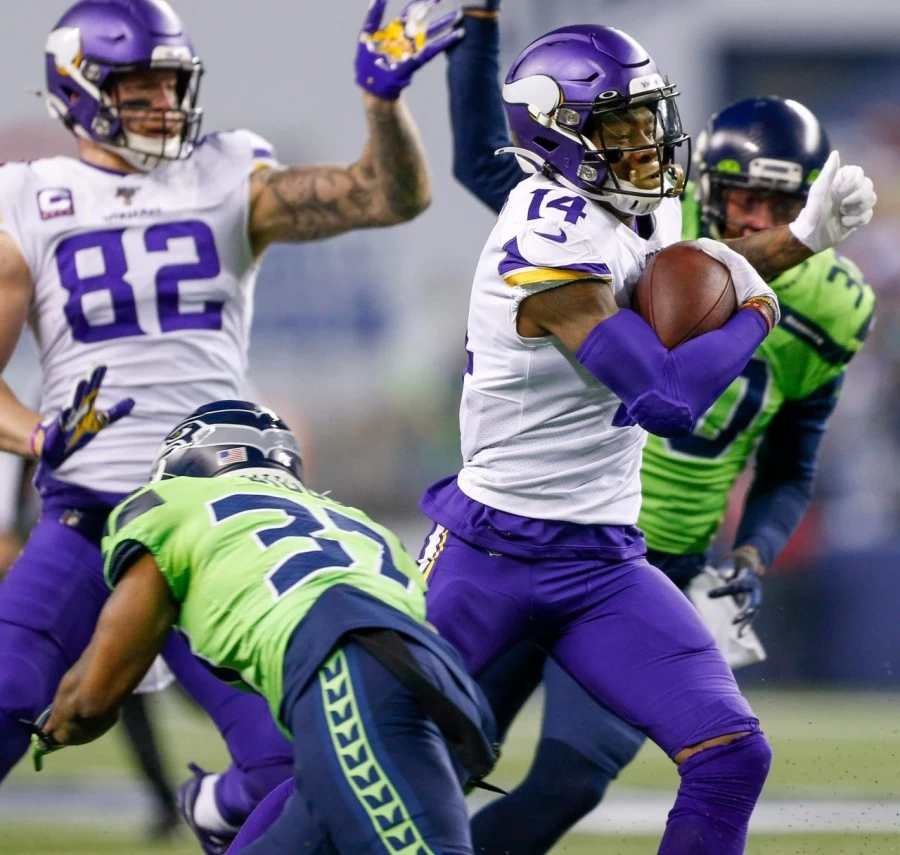 Seattle also recovered a fumble on the ensuing kickoff. Cousins’s career record in Monday night games dropped to 0-8. It was a potentially costly defeat for the Vikings, as tailback Dalvin Cook left the game with a shoulder injury suffered on a second-half play on which he lost a fumble. Wilson threw a pair of second-half touchdown passes after a first-half blunder in which he inadvertently batted the football, after it was deflected at the line of scrimmage, to Vikings safety Anthony Harris for an interception for a touchdown. Running backs Chris Carson and Rashaad Penny each had a rushing touchdown for Seattle. Tip drill pick-six!